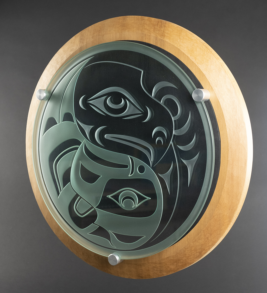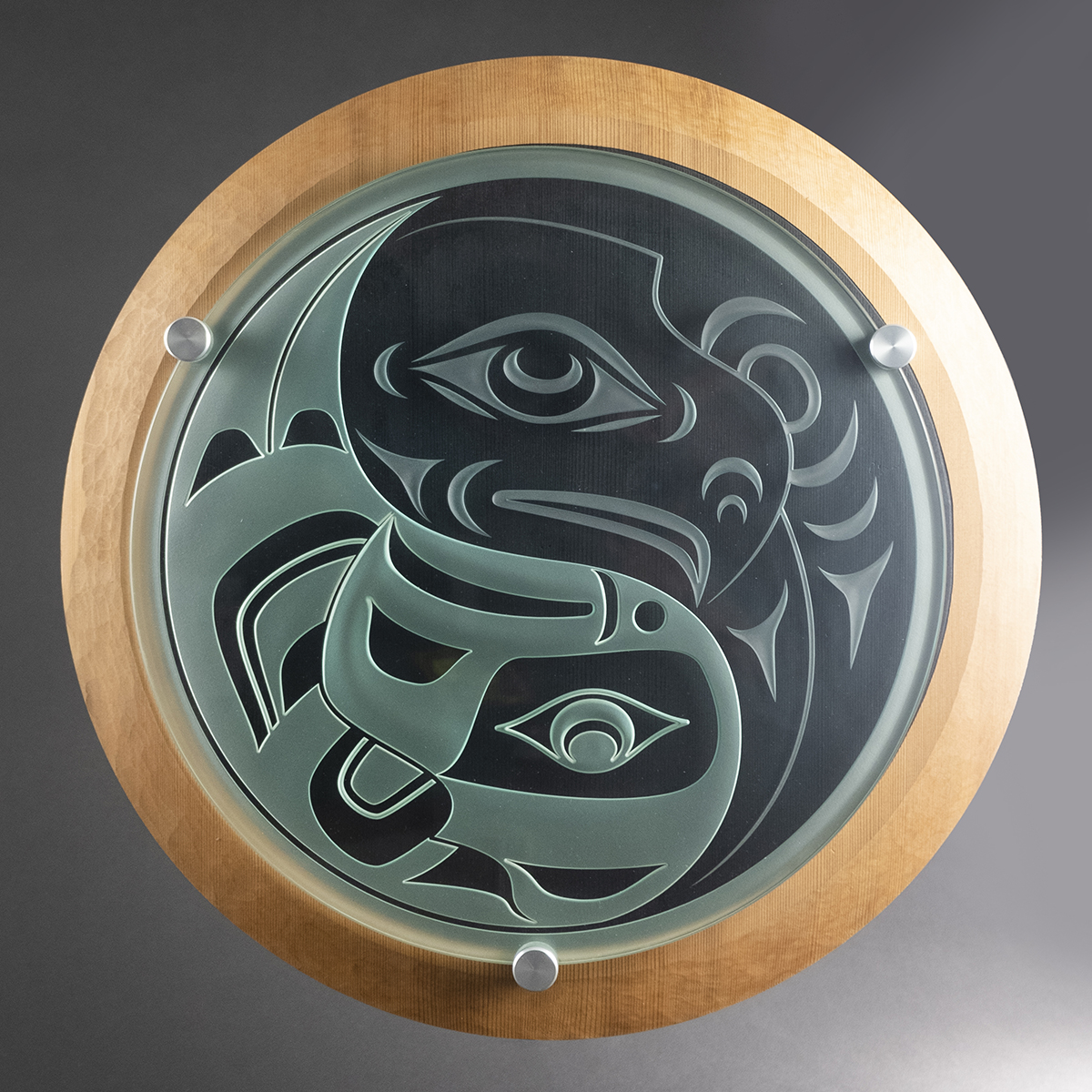 The “North and South” panel eloquently illustrates the two different, two-dimensional art styles found in Northwest Coast art. One eagle in the panel represents the Coast Salish two-dimensional design found in southern Northwest Coast (southern British Columbia and Washington State) and the other eagle represents the Northern Northwest Coast Formline two-dimensional design found in the northern region (southeast Alaska and northern British Columbia).