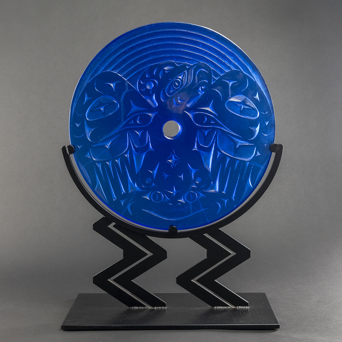 Joe (wahalatsuʔ) Seymour, Jr.Orca and Salmon Spindle WhorlSand Carved Starfire Glass, Yellow Cedar