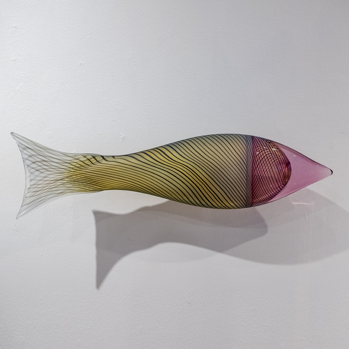 Dan FridayGray/Green Glass Salmon with Magenta NoseBlown, Hot-Sculpted and Sandblasted Glass, Metal Brackets